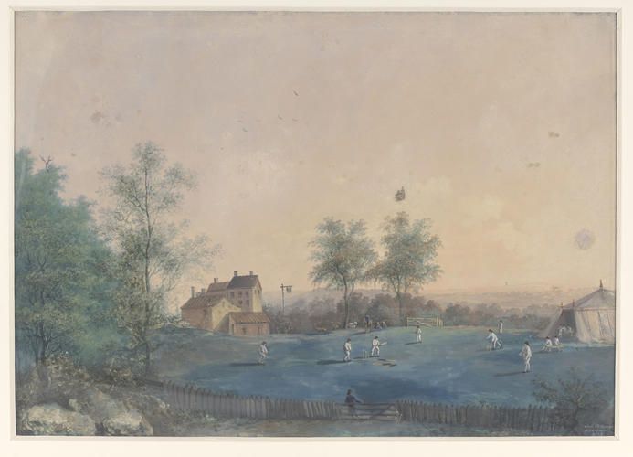 The painting has come to be known as Cricket at the Artillery Ground, but this is a misnomer. The picture was originally described as A Game of Cricket as played in the Artillery Ground, the Ground of the Honourable Artillery Company being the most famous of its day, and the misunderstanding arose from that. In fact, the Artillery Ground was walled in, so this picture is obviously somewhere else. Note, this is a single-wicket match; there is only one wicket and one batsman. Also, the hockey-stick style bat is being used