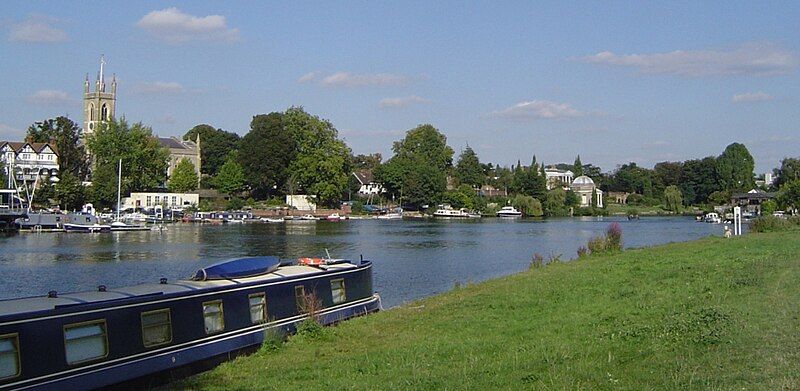 A match at Moulsey Hurst on the south bank of the Thames. The view across the river includes the church tower, the small island, Garrick’s Ait, and Garrick’s Temple to Shakespeare.