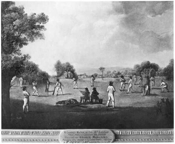 Lords and Gentlemen of Surrey and Kent playing cricket at Knowle Park, Kent, 1775. Artist not known.