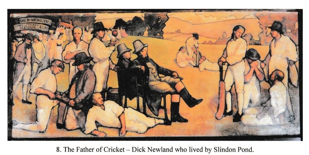 Unfortunately, when Slindon cricket is remembered, it often crops up as a kind of rival with Hambledon for the title cradle of cricket, when, in fact, in neither case is the title remotely appropriate; cricket was widely played as a folk game well over 100 years before the glory days of either club. It is valid, though, to see Slindon as a forerunner to Hambledon. They, too, are a small village which had a golden generation of players, and there is an important family link. One of Richard Newland’s sisters, Susan, married Richard Nyren of Eartham, and their eldest son, Richard, became the famous captain of Hambledon in the 1770s and landlord of the Inn at Broadhalfpenny Down. John Nyren (the son of the younger Richard Nyren) in Cricketers of Our Time says that Newland taught his nephew to play cricket. Slindon’s story, however, lacks a little lustre, as there is no record of matches at Slindon’s ground, and they had no hagiographer like John Nyren to immortalise their glory days. Nevertheless, in the 1740s, they must have been a strong contender for the title of finest team in the land, and their history is greatly to be celebrated.