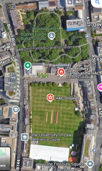 Google Earth view of the Ground as it is now. The other feature that survives from the great days of the ground is the non-Conformist Bunhill Fields Burial Ground to the North; it was then the case that there were fewer obstacles between the burial ground and the cricket field. There are many records of people climbing the walls of the burial ground to get a sight of the action or, perhaps, to get in without payment.