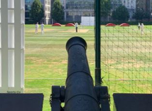 The match in progress here is HAC v MCC, 2022, a fixture loaded with historic resonance. The gun is for effect only.