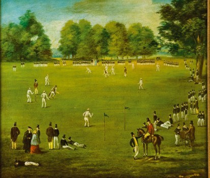 This painting is as much about the game as about the three sitters in the foreground: a professionally made bat of correct proportion, a worn ‘pitch’, a hat to stop the ball, ‘suitable’ dress and distant figures describing the act of bowling. The grip of the batter, however, seems to lack commitment, and the keeper is not concentrating on the task at hand.
