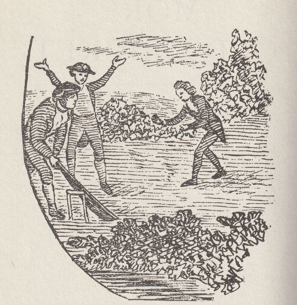 From A Little Pretty Pocket-Book, intended for the Amusement of Little Master Tommy and Pretty Miss Polly with Two Letters from Jack the Giant Killer – a 1744 children’s book by British publisher John Newbery. The picture is clearly derived from the 1742 Eton one above – especially the mound in the middle and the mid-wicket fielder in the ‘I surrender’ position.